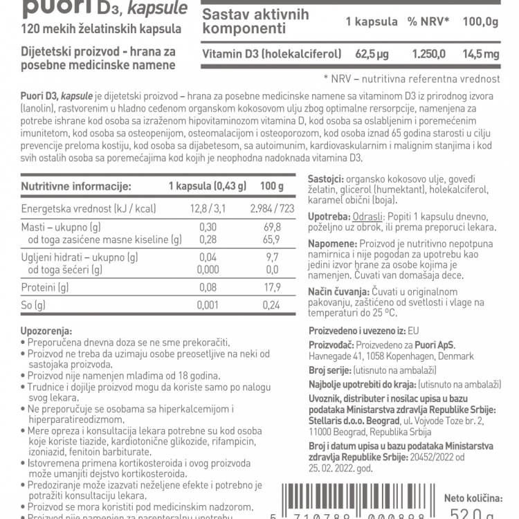 Uz ograničenu sunčevu svetlost tokom zimskih meseci, jedan od najbezbednijih i najisplativijih načina za povećanje nivoa vitamina D je suplementacija. Velika meta-analiza koja se bavi optimalnom dozom suplementacije širom sveta sugeriše da je unos od 2000-3000 i.j. Vitamina D3 dnevno adekvatan za održavanje adekvatnih zdravih nivoa vitamina D. Rezultat testiranja čistoće svake serije možete proveriti skeniranjem QR koda na svakoj bočici Puori D3.