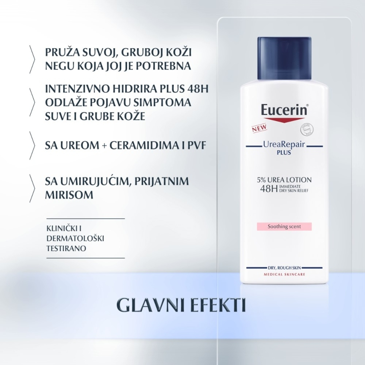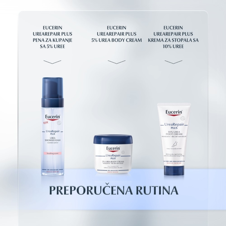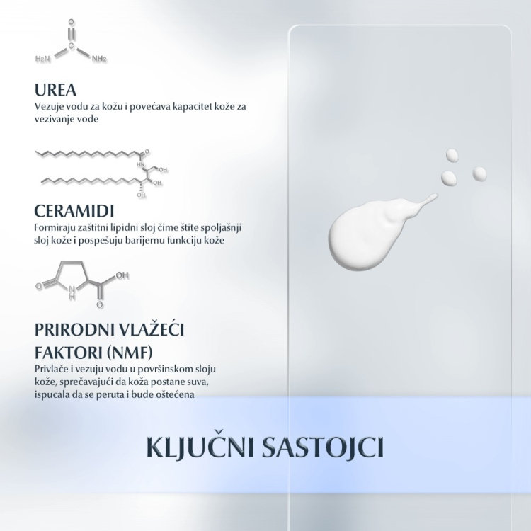Urea, kao i ostali prirodni vlažeći faktori (PVF) i ceramidi - vezuje vodu za kožu i obnavlja prirodnu barijernu funkciju kože kako bi se sprečio gubitak vlažnosti.