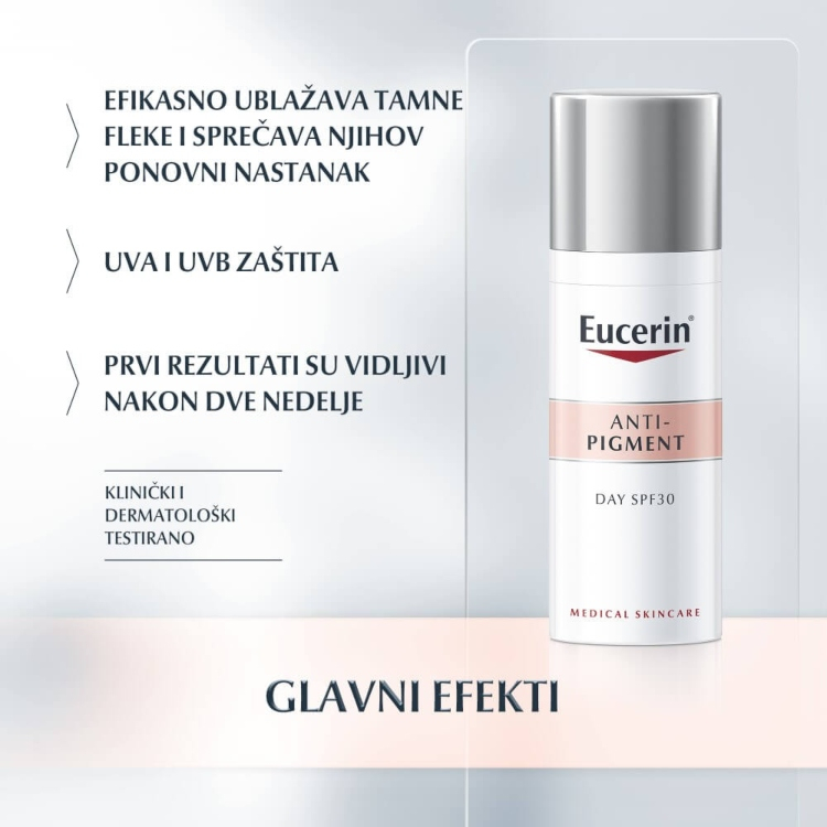 Klinički i dermatološki je dokazano da smanjuje tamne fleke i neujednačen ton kože nastao usled hiperpigmentacijskih poremećaja. Sadrži B-Rezorcinol za smanjenje produkcije melanina i pojave hiperpigmentacija, gliciretinsku kiselinu za stimulaciju regenerativnih procesa u vašoj koži sa,a visokim SPF 30 i UVA zaštitom, efikasno sprečava dalje oštećenje od sunčevih zraka i pigmentaciju.