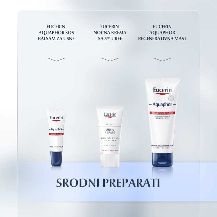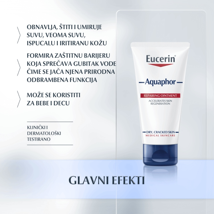 Eucerin Aquaphor regenerativna mast veoma suvoj i iritiranoj koži pruža hitnu negu koja joj je neophodna. Ona formira zaštitnu barijeru koja sprečava gubitak vode, a dopušta koži da diše čime se jača njena prirodna odbrambena funkcija. Glicerin u formulaciji vezuje vodu i pomaže da se ona zadrži u koži. Deluje zajedno sa pantenolom koji ubrzava proces regenracije i obnove i takođe hidrira kožu.