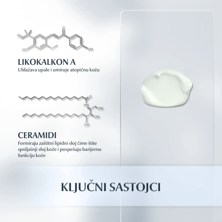 Hrani, umiruje i regeneriše atopičnu kožu i obnavlja njenu barijernu funkciju. Ublažava grubost, svrab i osećaj zategnutosti.