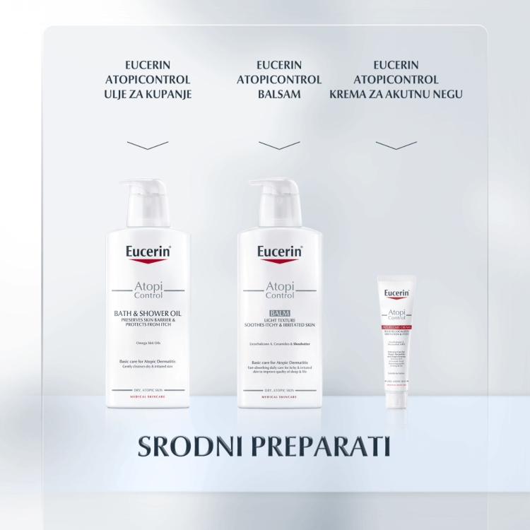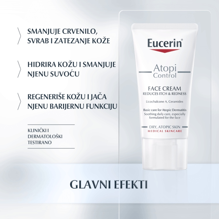 Eucerin AtopiControl Krema za lice je specijalno formulisana da pruži osnovnu dnevnu negu atopičnoj koži i može da se koristi tokom upalnih faza kao i u periodima mirovanja. Kliničkim i dermatološkim studijama je dokazano da hidrira i umiruje kožu kao i da smanjuje njenu suvoću. Nelepljiva formulacija je obogaćena likokalkonom A i ceramidima koji regenerišu kožu i jačaju njenu barijernu funkciju, smanjuju osećaj svraba i zategnutosti.