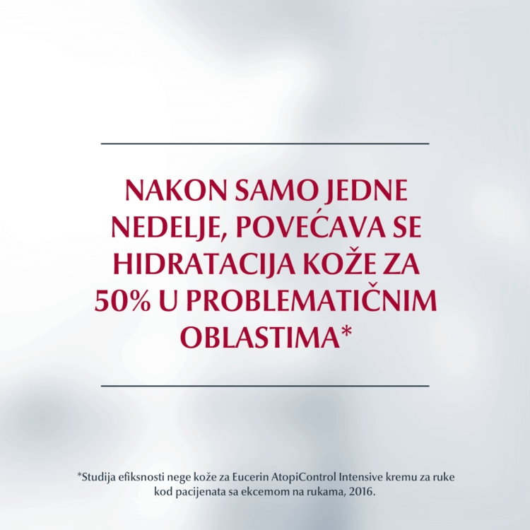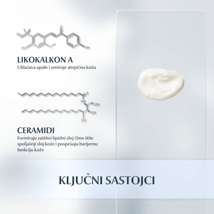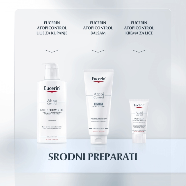 Eucerin AtopiControl Krema za ruke omekšava i umiruje kožu. Brzoupijajuća i nelepljiva formulacija ima jedinstvenu kombinaciju aktivnih sastojaka koju čine umirujući Likokalkon A, dekandiol koji deluje antibakterijski i mentoksipropandiol (MDP) koji oslobđa od svraba. Ovaj kompleks, kombinovan sa visokom koncentracijom ceramida i avene sative (ovasa), jača barijeru kože, smanjuje suvoću i oslobađa od osećaja svraba. Ne sadrži parfeme. Iako je veoma cenjen zbog umirujućeg svojstva, neki ljudi mogu biti alergični na ovas.