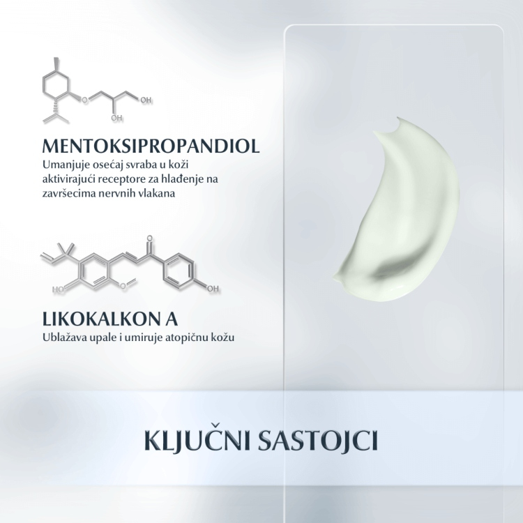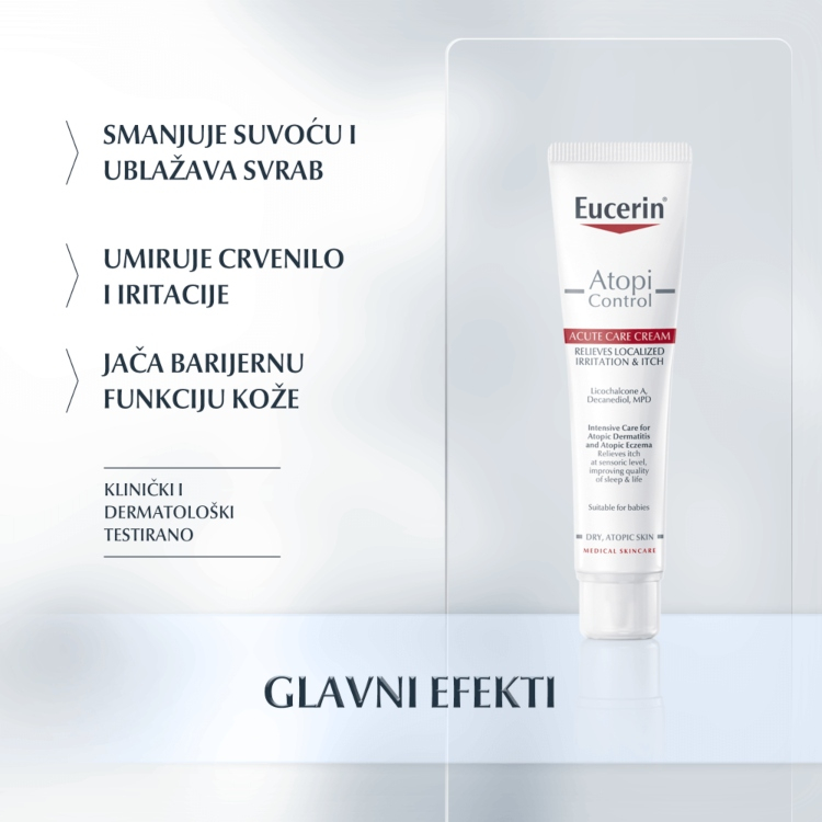 Eucerin AtopiControl Krema za akutnu negu je specijalno formulisana da pruži olakšanje i intenzivnu negu koži u upalnoj fazi atopijskog dermatitisa. Formulacija sadrži jedinstveni kompleks aktivnih principa koji čine likokalkon A koji ima ulugu da umiruje kožu, dekandiol koji deluje antibakterijski i mentoksipropandiol (MPD) koji hladi i deluje potiv svraba. Ovaj kompleks, kombinovan sa visokom koncentracijom ceramida, jača barijernu funkciju kože, smanjuje suvoću i oslobađa od svraba na senzornom nivou čime se smanjuje potreba za češanjem.