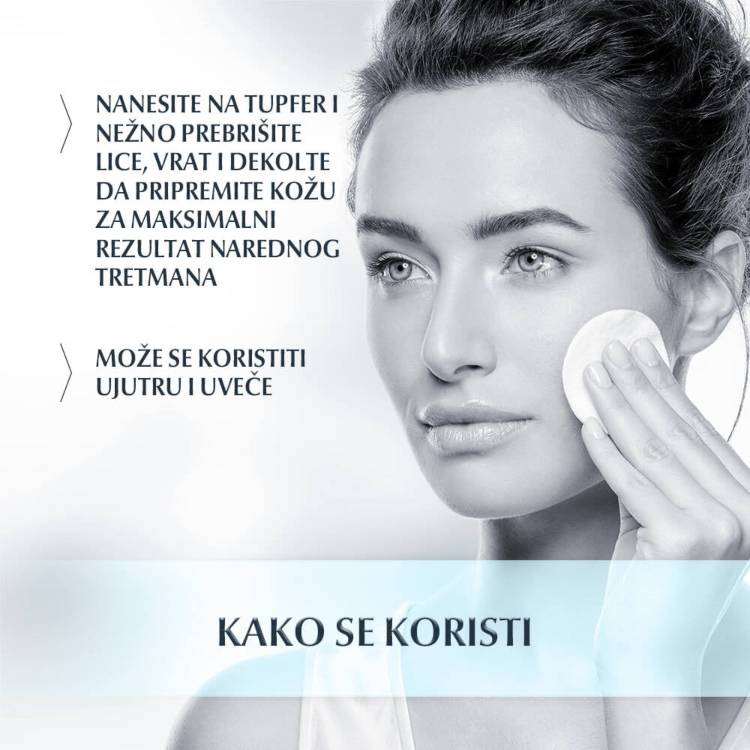Nanesite na tupfer i nežno očistite lice, vrat i dekolte nakon čišćenja DermatoCLEAN mlekom ili gelom. Nakon toga nanesite odgovarajući preparat za negu.
