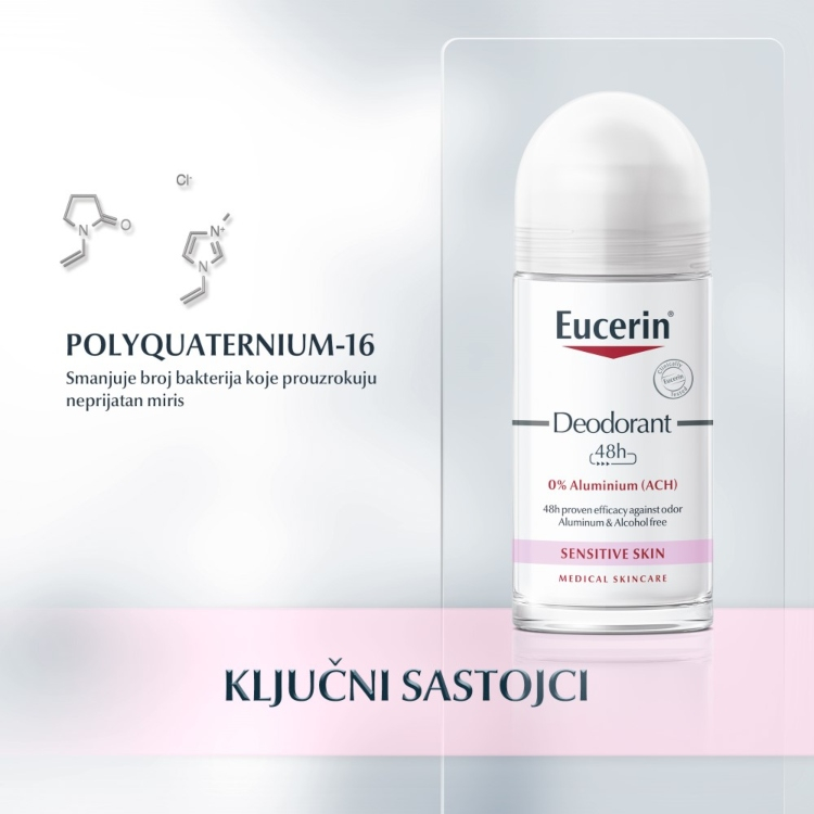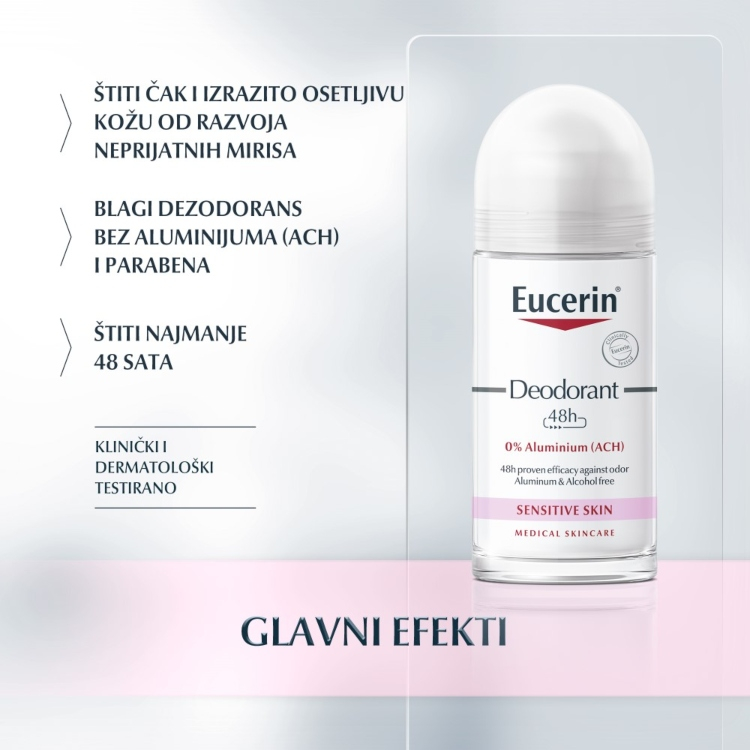Eucerin Dezodorans pH5 Roll-On sa 0% aluminijuma ne sadrži ni aluminijum (ACH), ni alkohol, ni parabene. Čak i posebno osetljiva koža (i ona sa neurodermatitisom) dobro podnosi ovaj proizvod. Ovaj dezodorans je toliko blag da može da se nanese na kožu odmah nakon brijanja ili epilacije. Ne peče, ne iritira kožu, provereno štiti najmanje 48 sata od neprijatnih mirisa. Istovremeno, neupadljiv uniseks miris pojačava osećaj svežine.