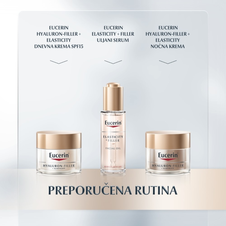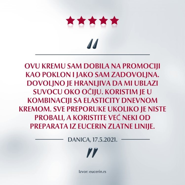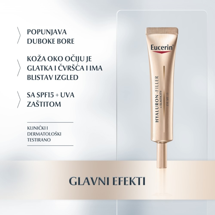 Jedinstvena formulacija koja pruža višestruke anti-age efekte. Eucerin inovativna kombinacija hijaluronske kiseline dugog i kratkog lanca i arktina (komponente koja dokazano ubrzava obnavljanje kolagena u ćelijama kože), popunjava čak i duboke bore. Koža oko očiju je glatka i čvršća i ima blistav, odmoran izgled.