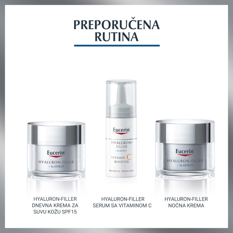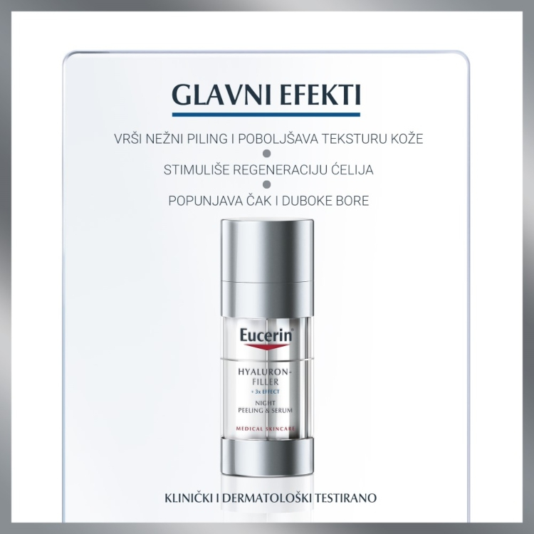 Dermatolozi koriste injekcije hijalurona i pilinge kako bi podmladili kožu koja stari. Inspirisan ovim tretmanima, Eucerin Hyaluron-Filler Noćni intenzivni serum kombinuje dve moćne formule za višestruke anti-age efekte: