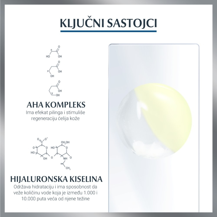 - Obnovljenje teksture kože i sjaj: Kremasta emulzija sadrži efikasni AHA kompleks (kompleks alfa-hidroksikiselina)i glicin saponine.