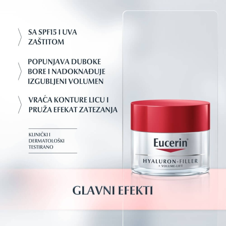 Ova krema kombinuje tri aktivna sastojka koji ciljaju specifične slojeve kože: Magnolol povećava veličinu i broj ćelija koje koži daju volumen*, oligo peptidi jačaju mrežu kolagena i podstiču obnavljanje kolagena* i hijaluronska kiselina koja inenzivno hidrira kožu i popunjava bore. Redovnom upotrebom, Eucerin Hyaluron-Filler + Volume-Lift Dnevna krema pomaže da se nadoknadi izgubljeni volumen i vrate konture licu. Fine linije i duboke bore su vidno smanjene, a kože je primetno nežnija i mekša.