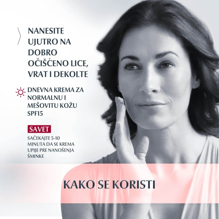 Sa SPF 15 i UVA zaštitom, anti-age krema takođe pomaže u sprečavanju fotostrenja (prevremenog starenja kože uzrokovanog suncem).