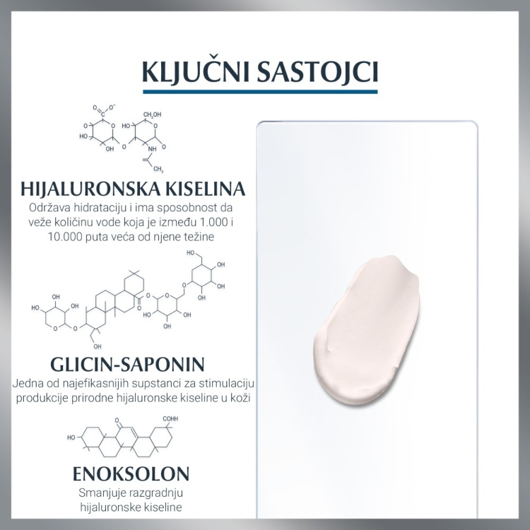 Jedinstvena kombinacija hijaluronske kiseline kratkog i dugog lanca ciljano popunjava cak i duboke bore.Hijaluronska kiselina dugog lanca poboljsava hidrataciju u povrsinskim slojevima koze,dok hijaluronska kiselina kratkog lanca prodire u dublje epidermalne slojeve gde se duboke bore formiraju.