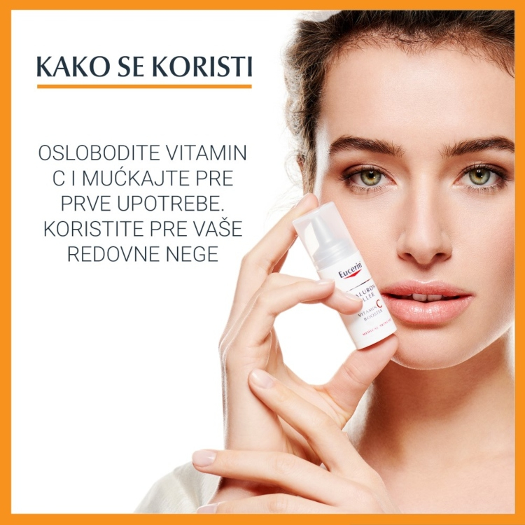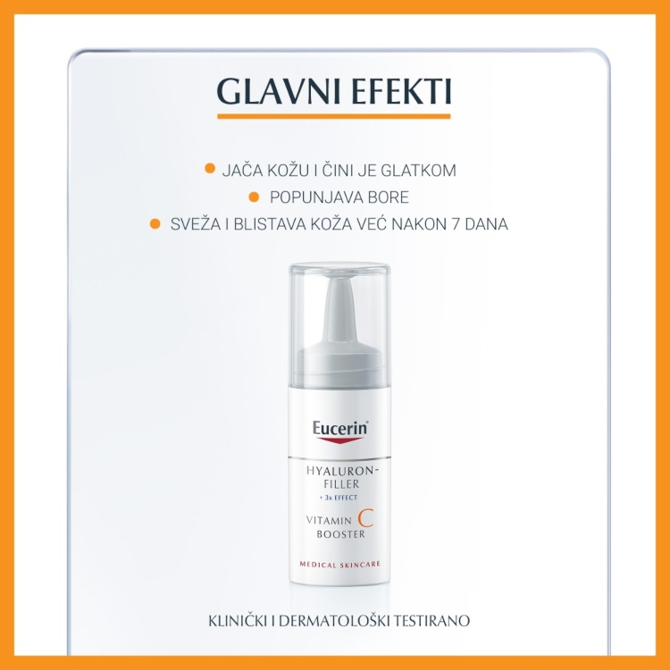 Eucerin Hialuron-Filler Vitamin C Booster je pogodan za sve tipove kože i klinički i dermatološki je dokazano da ojačava kožu i popunjava bore.