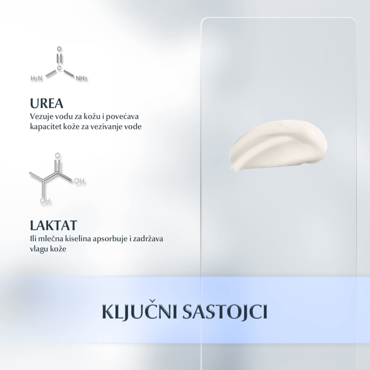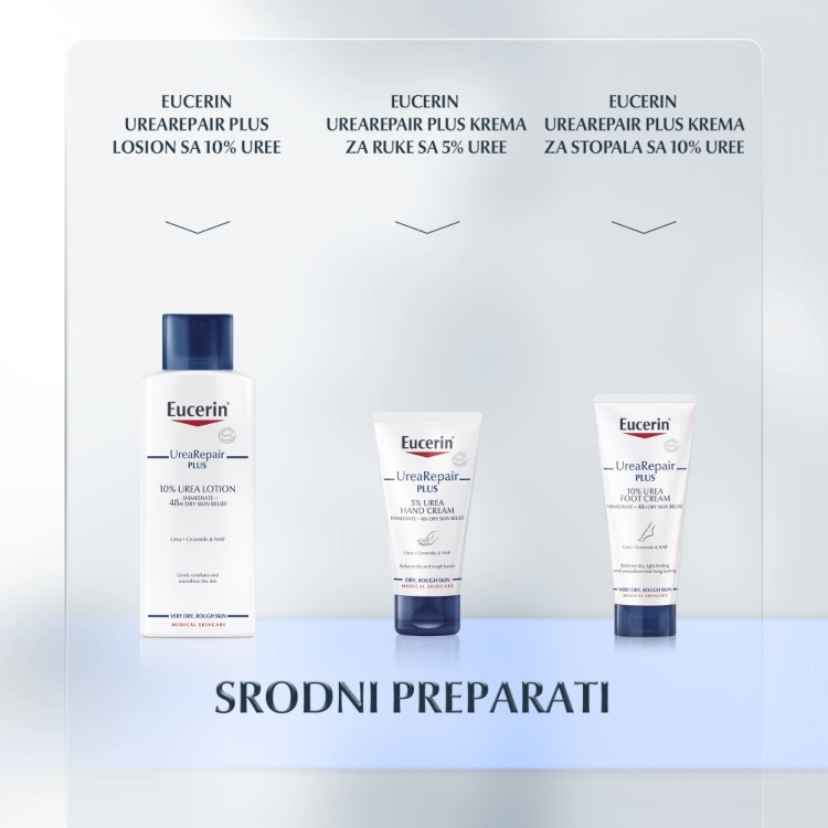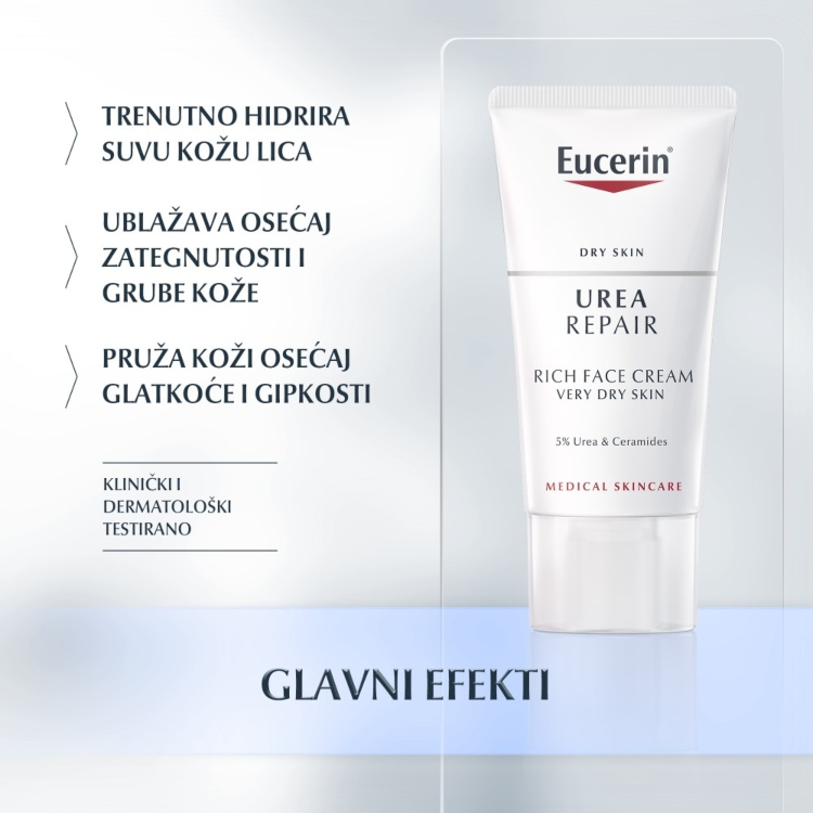 Eucerin Noćna krema sa 5% Uree je intenzivna noćna krema za suvu i veoma suvu i zategnutu kožu. Obogaćena ureom i mlečnim kiselinama, dva prirodno prisutna jedinjenja koja vezuju vodu, trenutno hidrira suvu kožu lica, ublažavajući osećaj zategnutosti. Osim što ublažava simptome grube kože održavanjem hidratantnosti (gruba koža je obično izazvana nedstatkom vlažnosti), Eucerin Noćna krema sa 5% uree takođe umiruje kožu keratoličkim dejstvom uree. Kako smanjuje isušenost i ublažava zategnutost i grubu kožu, pogodna je za simptome suve kože kao što je psorijaza.