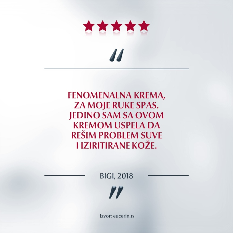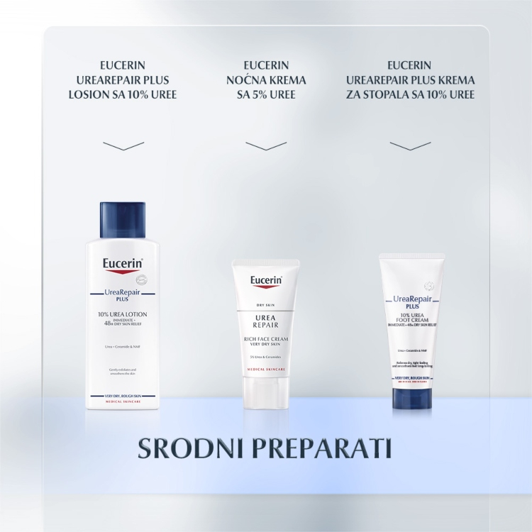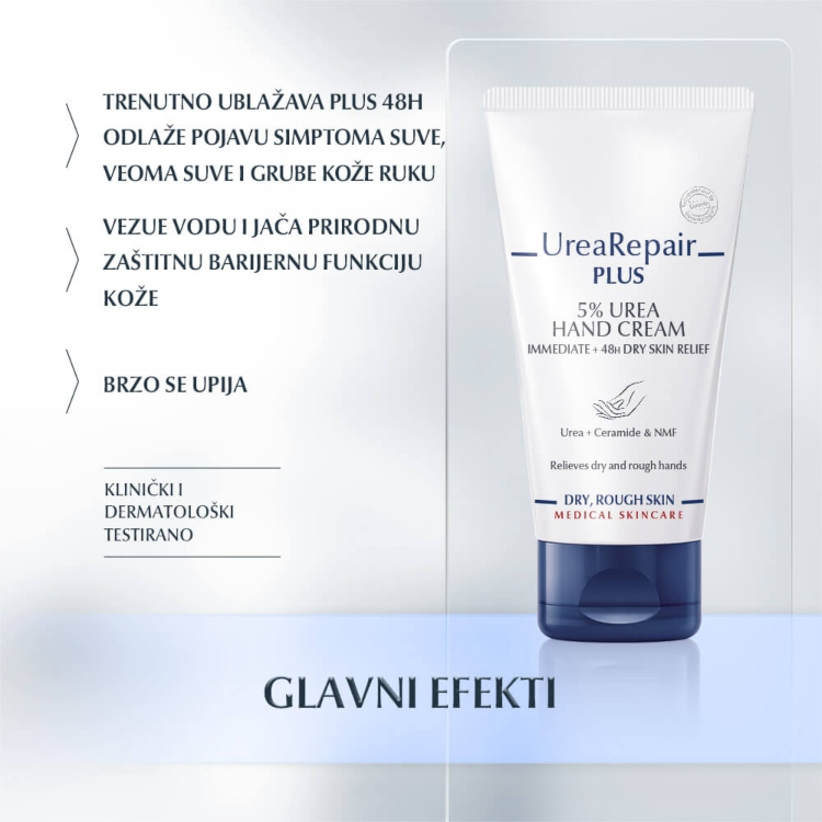Eucerin UreaRepair Plus Krema za ruke sa 5% uree sadrži ureu, ceramide i ostale prirodne vlažeće faktore (PVF). Klinički je dokazano da trenutno ublažava simpotome suve kože i da intenzivno hidrira veoma suvu, grubu i zategnutu kožu ruku, čak i nakon ponavljanih pranja ruku. Ona jača prirodnu barijernu funkciju kože, čineći kožu hidriranom i do 48 časova.