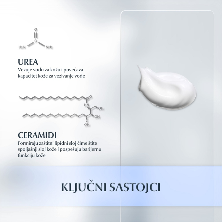 Aqua, Glycerin, Urea, Dibutyl Adipate, Glyceryl Stearate, Stearyl Alcohol, Dicaprylyl Ether, Cetearyl Alcohol, Sodium Lactate, Tapioca Starch, Glyceryl Stearate SE, Ceramide NP, Mlečna kiselina, Arginine HCL, Sodium PCA, Cholesterol, Helianthus Annuus SeedOil, Alanine, Karnitin, Glycine, Sodium Chloride, Dimethicone, Xanthan Gum, Sodium Cetearyl Sulfate, Decylene Glycol, Phenoxyethanol, Pentylene Glycol