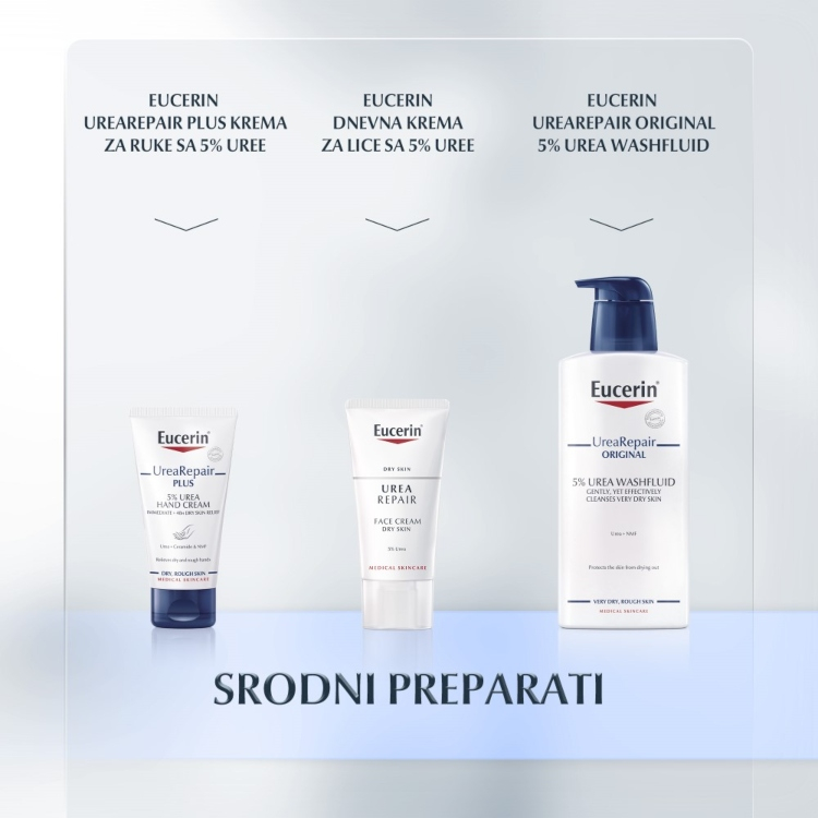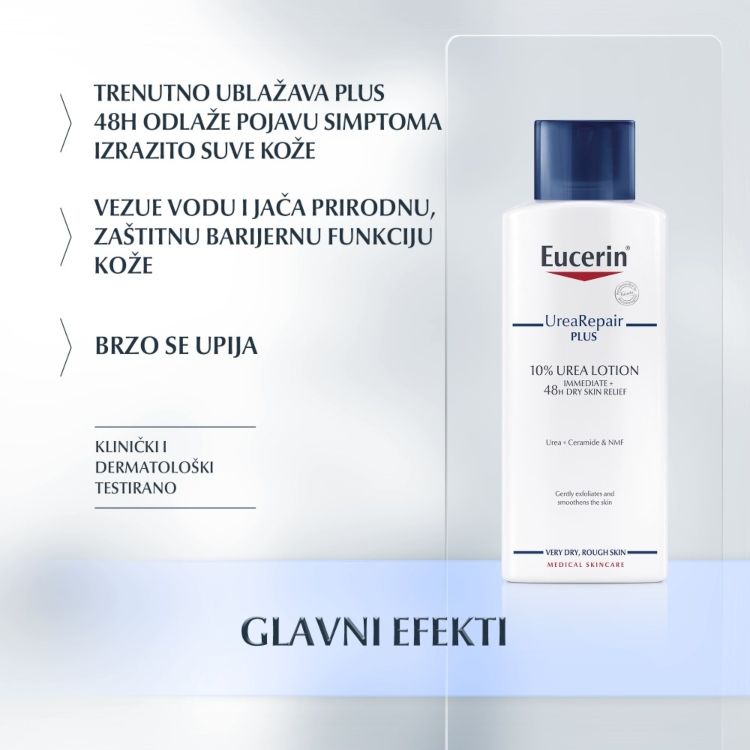 Izrazito suva koža dovodi do osećaja zatezanja, crvena je, gruba, peruta se i svrbi. Kada je koža suva, sposobnost da veže vodu i spreči njen gubitak joj je smanjena. Eucerin UreaRepair Plus Losion za telo sa 10% uree daje izrazito suvoj koži, koja je praćena svrabom i perutanjem, negu koja joj je potrebna.