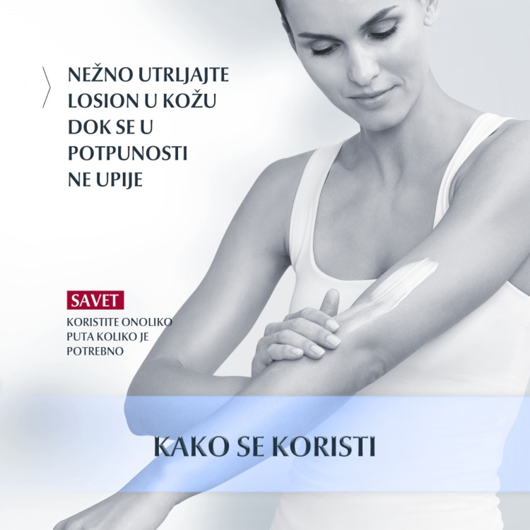 Nanesite preparat na čistu i suvu kožu i nežno utrljajte dok se u potpunosti ne upije. Ukoliko je potrebno nanosite losion više puta u toku dana.