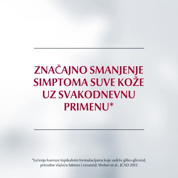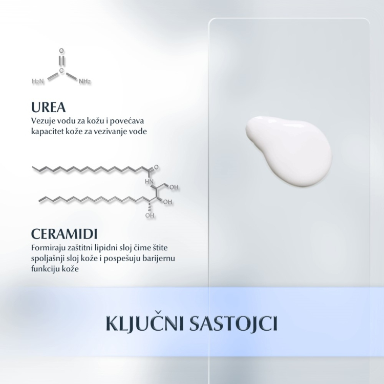 Ova formulacija sadrži ureu, ceramide i ostale prirodne vlažeće faktore (PVF) koji vezuju vodu i jačaju prirodnu, zaštitnu barijernu funkciju kože kako bi sprečili dalji gubitak vlažnosti.