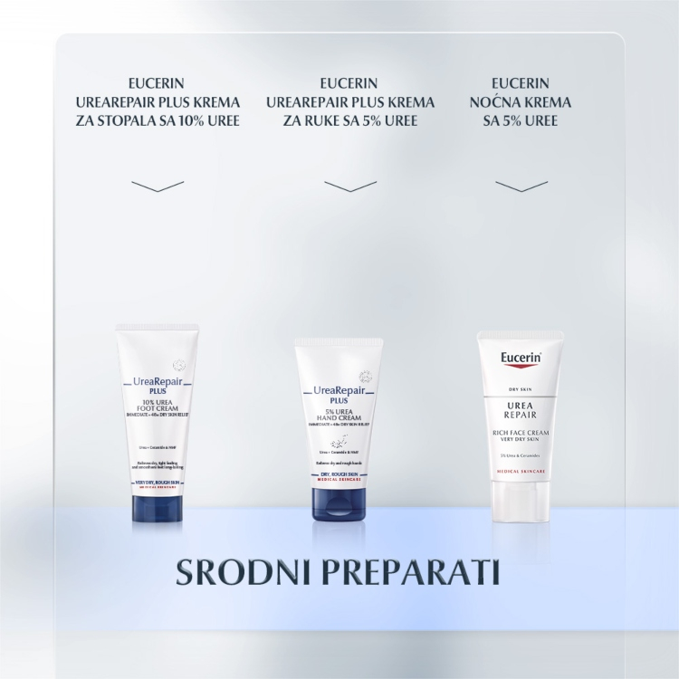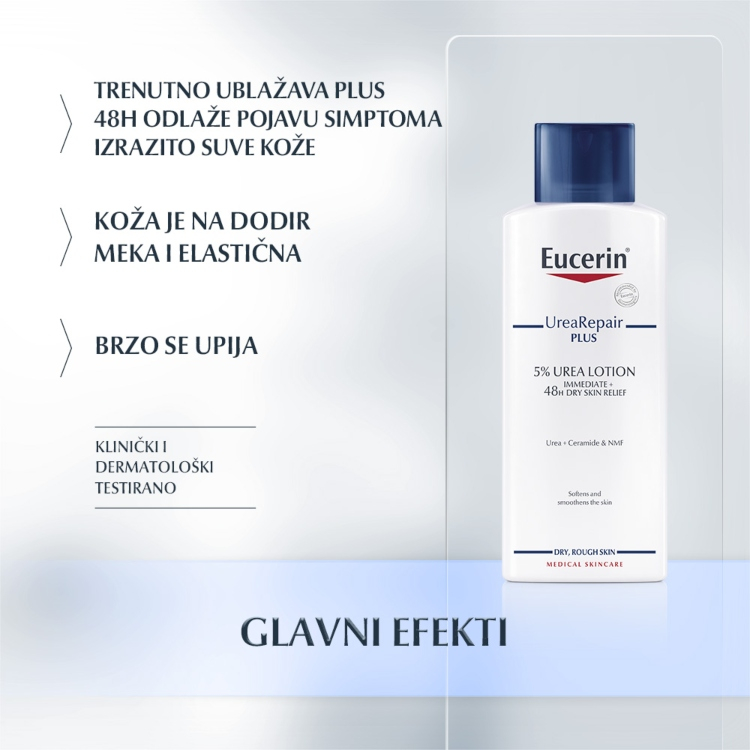 Suva koža dovodi do osećaja zatezanja, može biti crvena i gruba na dodir. Kada je koža suva, sposobnost da veže vodu i spreči njen gubitak joj je smanjena. Eucerin UreaRepair Plus Losion za telo sa 5% uree daje suvoj i gruboj koži negu koja joj je potrebna.
