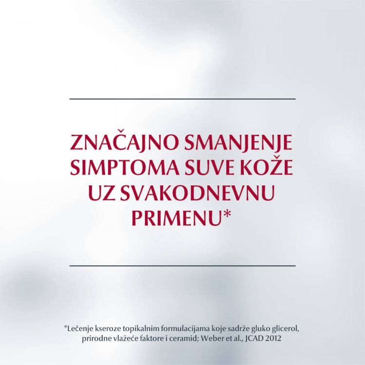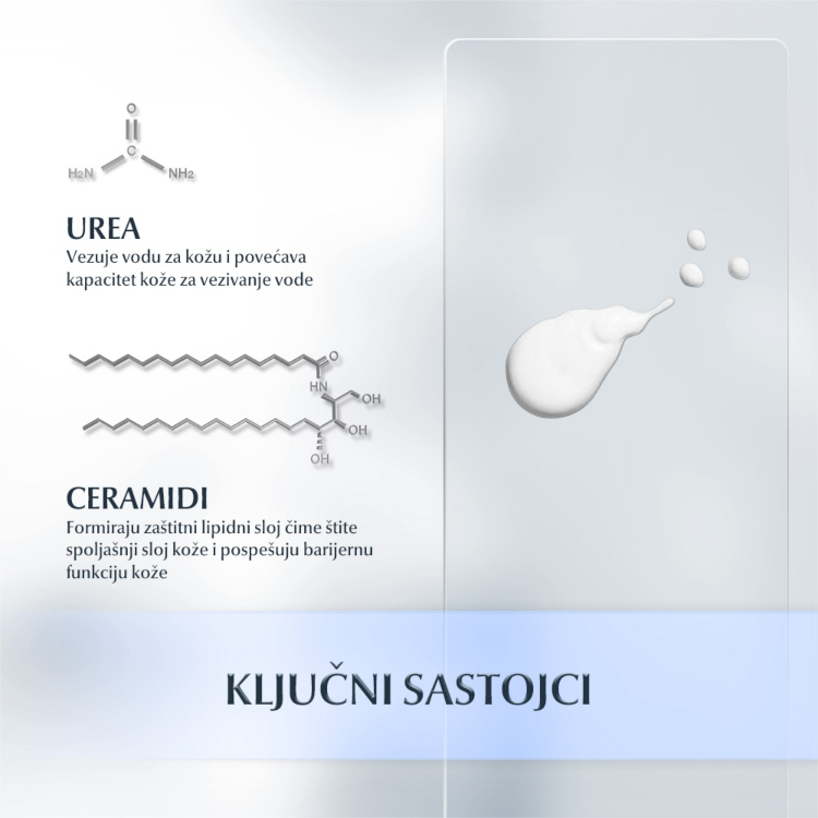 Ova formulacija sadrži ureu, ceramide i ostale prirodne vlažeće faktore (PVF) koji vezuju vodu i jačaju prirodnu, zaštitnu barijernu funkciju kože kako bi sprečili dalji gubitak vlažnosti.