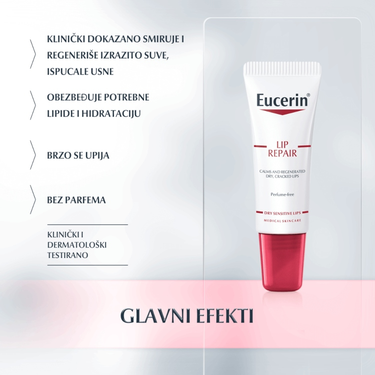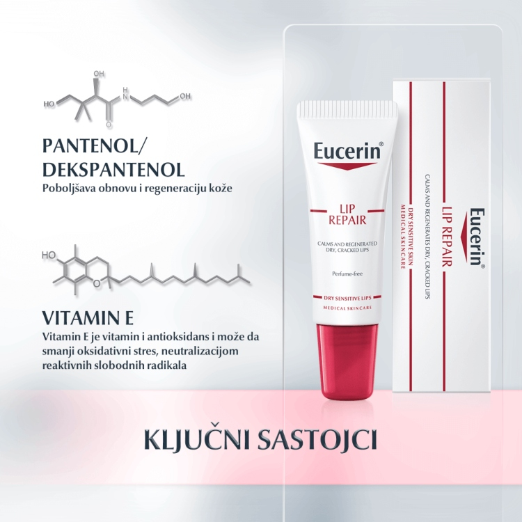 Eucerin balsam za negu i regeneraciju usana je visokoefikasni balsam koji sadrži aktivne sastojke koji deluju kako bi umirili i regenerisali ispucalu i iritiranu kožu.