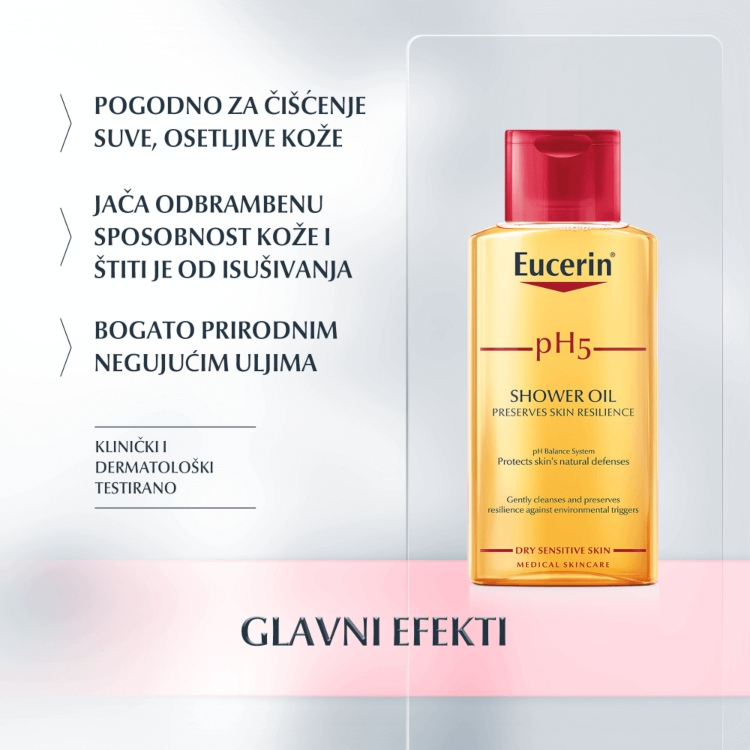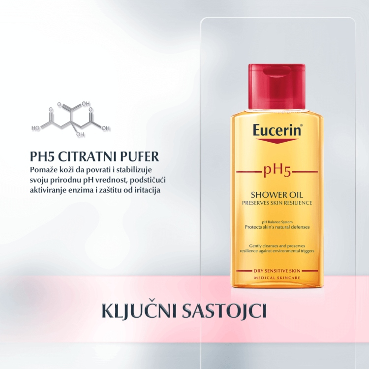 Eucerin pH5 Ulje za tuširanje je razvijeno na poseban način sa izuzetno blagim surfaktantima pogodnim za čišćenje suve, osetljive kože. Eucerinov jedinstveni pH sistem ravnoteže pruža formuli optimalnu pH vrednost kako bi se zaštitila prirodna odbrana kože i održala njena otpornost.